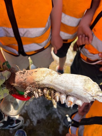 Da vi kom frem fikk barna leke litt blandt stauen. Noen ville studere insekter, så de fikk insektsglass og forstørrelsesglass. Andre ville samle nøtter og lete etter andre skatter. Barna ble fort sultne, så vi satte oss ned å spise pizzasnurrer mens vi observerte security sikre området. Det startet også å komme andre barn og voksne som ønsket å se på. Etter vi hadde spist, kom Filiokus. De hadde spist i barnehagen før de kom.