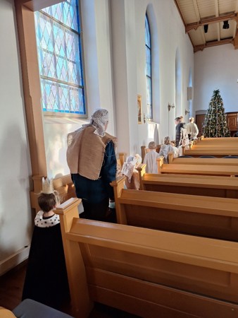 Barna ble ønsket velkommen av «Keiser Augustus», som skrev dem inn i manntallet i Betlehem. Deretter fulgte en interaktiv vandring gjennom julehistorien, hvor barna deltok aktivt ved å kle seg ut og oppleve historien på en levende måte. Samtidig sang vi kjente julesanger og tente lys i adventskransen, noe som skapte en varm og inkluderende atmosfære.