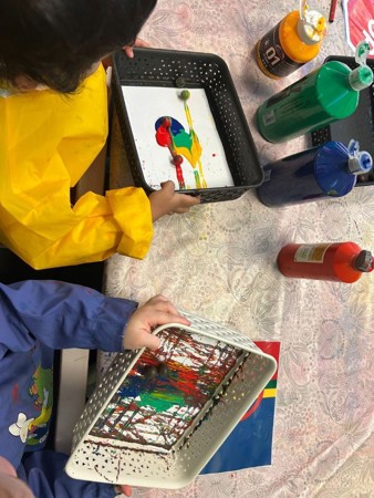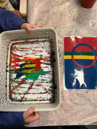 I dag fortsatte markeringen med aktiviteter inne. Barna fikk lage klinkekule-maling av det samiske flagget, og vi danset til den samiske "Bli med dansen". Vi har også brukt fjorårets samiske flagg til gjenbruk og laget nye kreative uttrykk. For å runde av markeringen, spiste vi tradisjonell samisk mat – bidos.