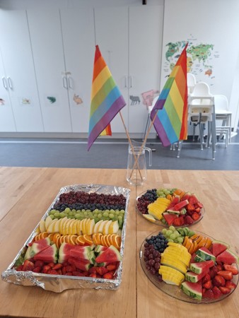 Alle barn og ansatte i Åkebakke gikk i tog med fargerike klær og flagg, med musikk og dans, før vi hadde ulike aktiviteter inspirert av fargenes betydning. Rødt for liv, oransje for helbred, gult for sol, grønn for natur, blå for kunst og lilla for ånd.