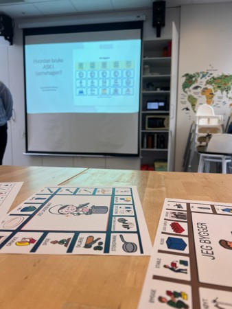 Torsdag hadde vi besøk av vår spesialpedagog Adele, som presenterte hvorfor bildestøtte er et viktig virkemiddel i barns språkutvikling. Vi ønsker å etablere bildestøtte som en naturlig del av vårt allmenne pedagogiske tilbud. Etter foredraget arbeidet vi videre med å utvikle lekemiljøene på avdelingene. Vi vurderte blant annet hva som mangler, hvor barna leker mest, og hvordan vi kan bruke symbolstøtte der barna oppholder seg. På denne måten ønsker vi å skape miljøer som fremmer både lek, språk og samspill.